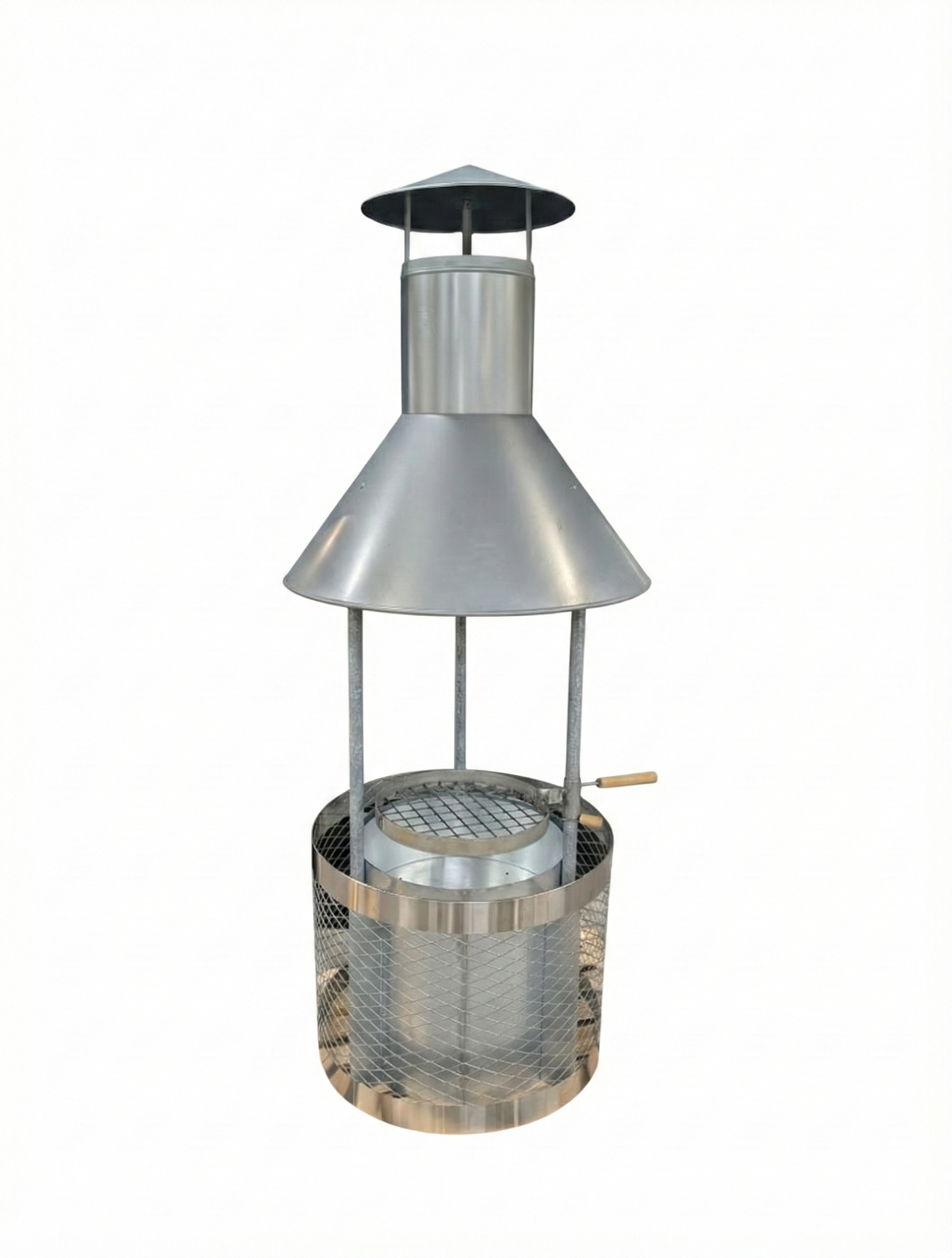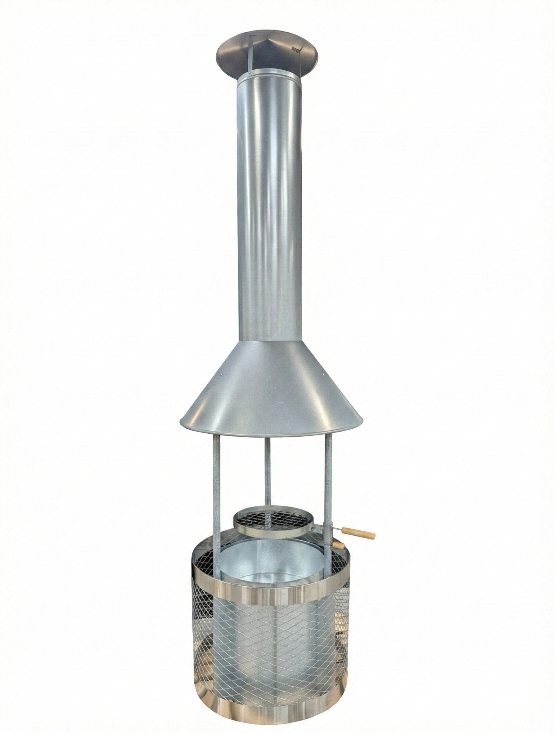 Grillin alaosan sisärengas on 1 mm sinkittyä peltiä, ulkokuori tehty sinkitystä ritilästä/verkosta. Kehää kiertää tyylikkäät rosteri-vahvikkeet. Pohja on korotettu joten tuli näkyy ja paistaminen on helppoa. Täytä itse mieleisillä kivillä. Toimitus sisältää kuvassa näkyvät ja grillaukseen soveltuvan ritilän. Suunniteltu soveltuvaksi myös pienelle muurinpohjapannulle. Hintaan sisältyy myös grillin yläpuolelle tuleva sinkitystä pellistä valmistettu kotahuuva, jolla ohjaat savut ylös. Huuvan voi itse halutessaan maalata kuuman kestävällä maalilla. Huuvan piipun pituuden voi päättää ilmoittamalla lisätiedoissa tilauksen yhteydessä. Tilaa tästä tyylikäs ulkogrilli pihaasi täydentämään!